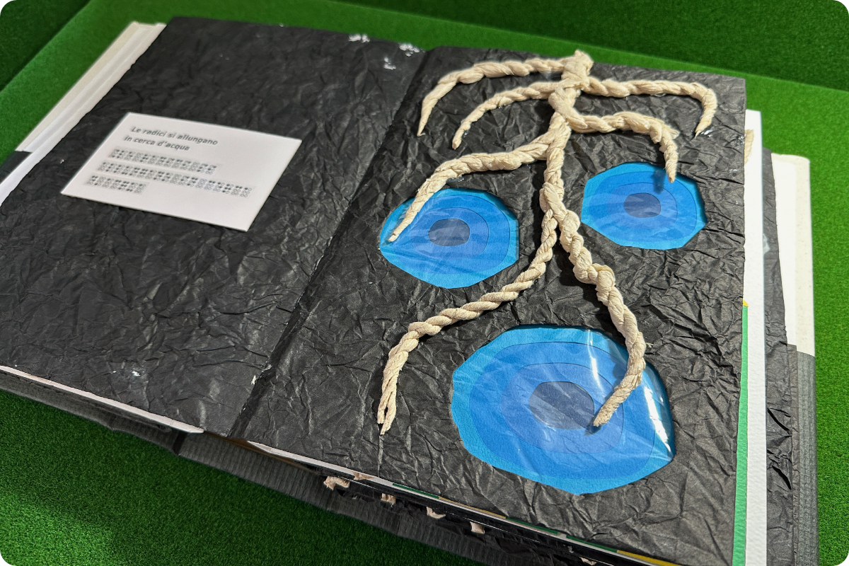 イタリアで行われた「木」をテーマにした展示会のために、この“さわる絵本”を制作しました。地平線をはさんで、枝は太陽へ、根は水と養分へ──木が上へ下へと広がる神秘的な姿を、指先で追いながら体感できます。目が見えにくい読者にも伝わるよう、凹凸や質感の異なる素材を組み合わせ、枝ぶりや根張りの力強さを立体的に表現しました。ページをめくるたびに、空と大地をつなぐ木の生命力が手の中に広がります。